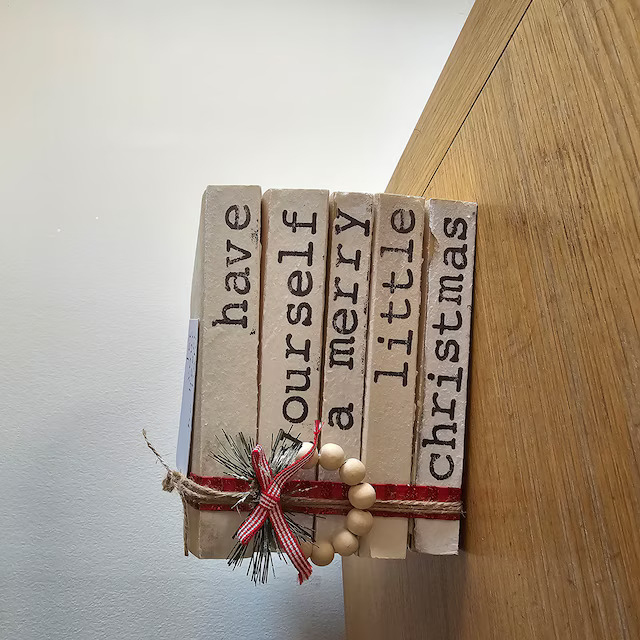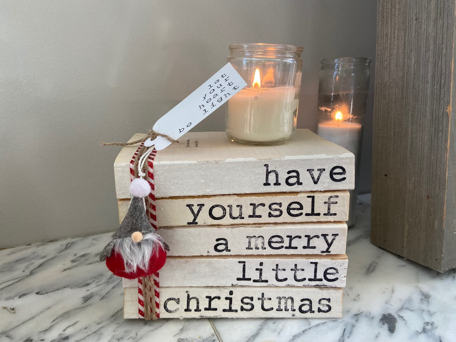 The hand-stamped, ribbon-wrapped bookstack with a meaningful message is made on order. Give it a personal touch by swapping the red gnome for a green one or even just a simple wreath. Width: 8 inches, Height: 6 inches, Depth: 5 inches. Perfect Christmas gift for a book lover.