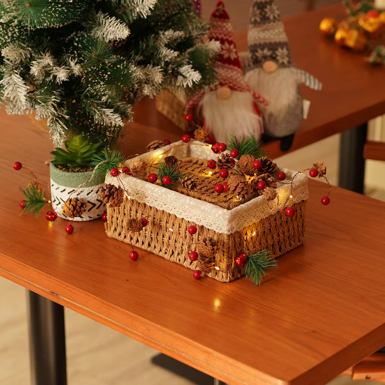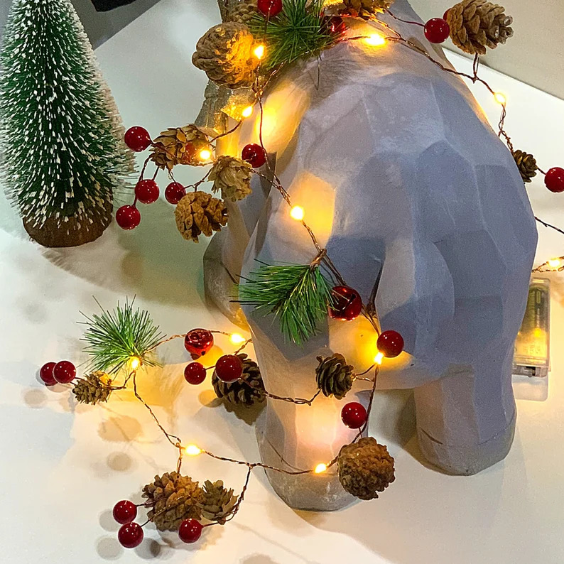 A chic LED lights garland featuring red berry, pine cone, mistletoe and jingle bell components which comes ready to hang. The components are held together by a durable PVC string measuring 7 feet long. The lights are soft and calming, creating the right atmosphere for the holidays.