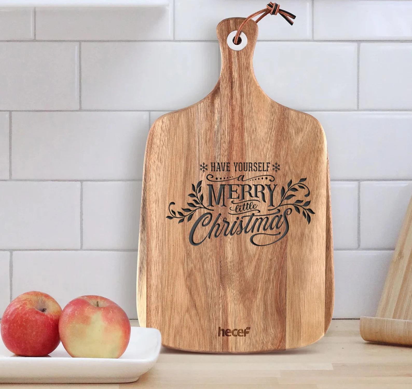 Measuring  14.57 x 8.46 x 0.5 inches, this cheese board is a stylish, kitchen addition that communicates the joyous season.