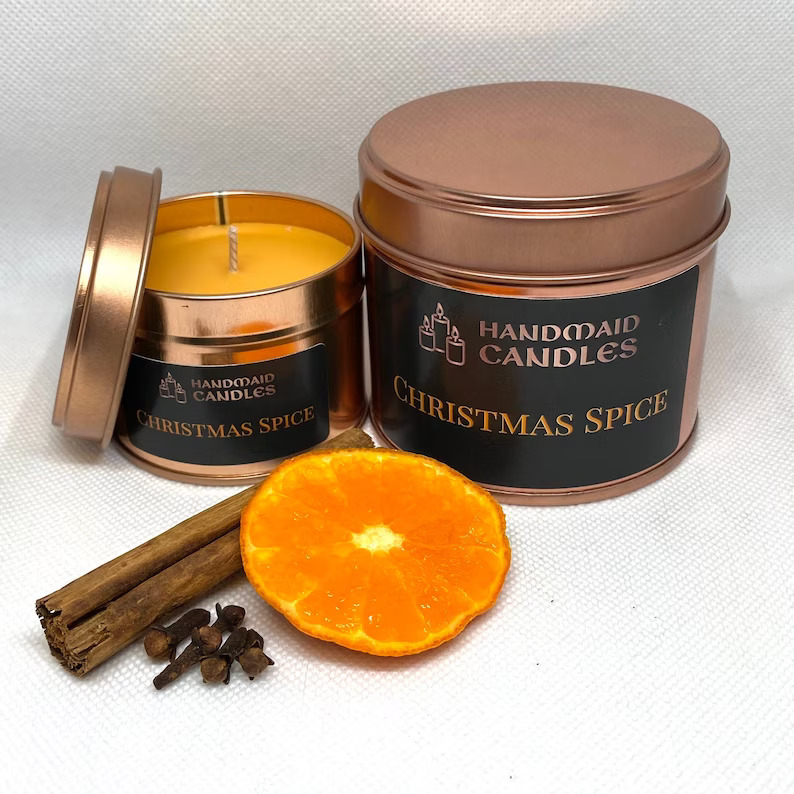+ Free ShippingThis spice scented Christmas candle housed in a fancy tin is a chic self care product or gift idea. Get 40 hours of burn time that exude a mix of eucalyptus, bergamot, cloves, cinammon and orange zest scents.