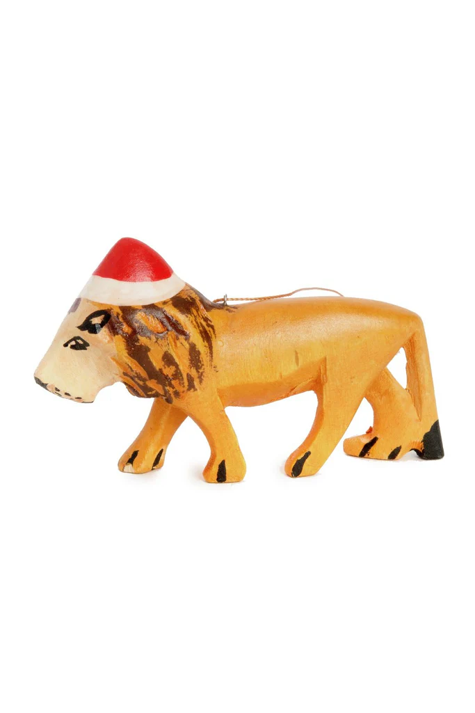 This hand-carved ornament depicts a lion donning a cute Santa hat. It is a beautiful piece to add to your holiday tree.